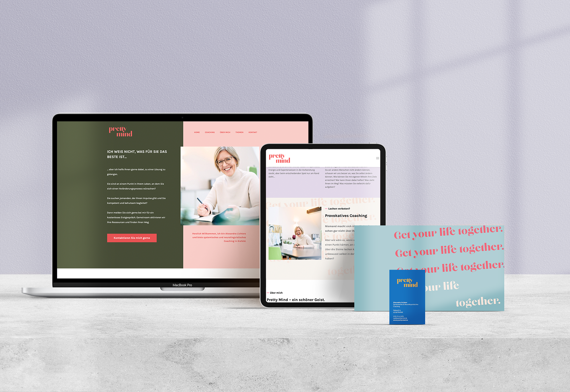 Für Pretty Mind haben wir ein visuelles Konzept entwickelt, das Persönlichkeit ausstrahlt und Struktur vermittelt. Die Farben sind kraftvoll, die Typografie selbstbewusst, das Design spielerisch und klar zugleich. So entsteht ein Auftritt, der Vertrauen schafft und das Coaching-Angebot von Alexandra Lichters authentisch transportiert.