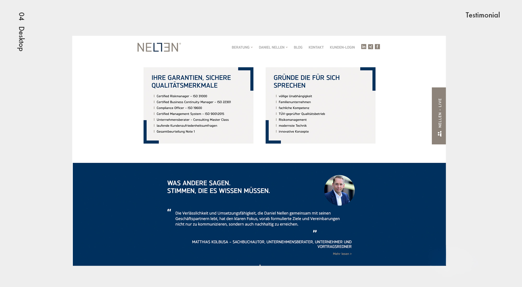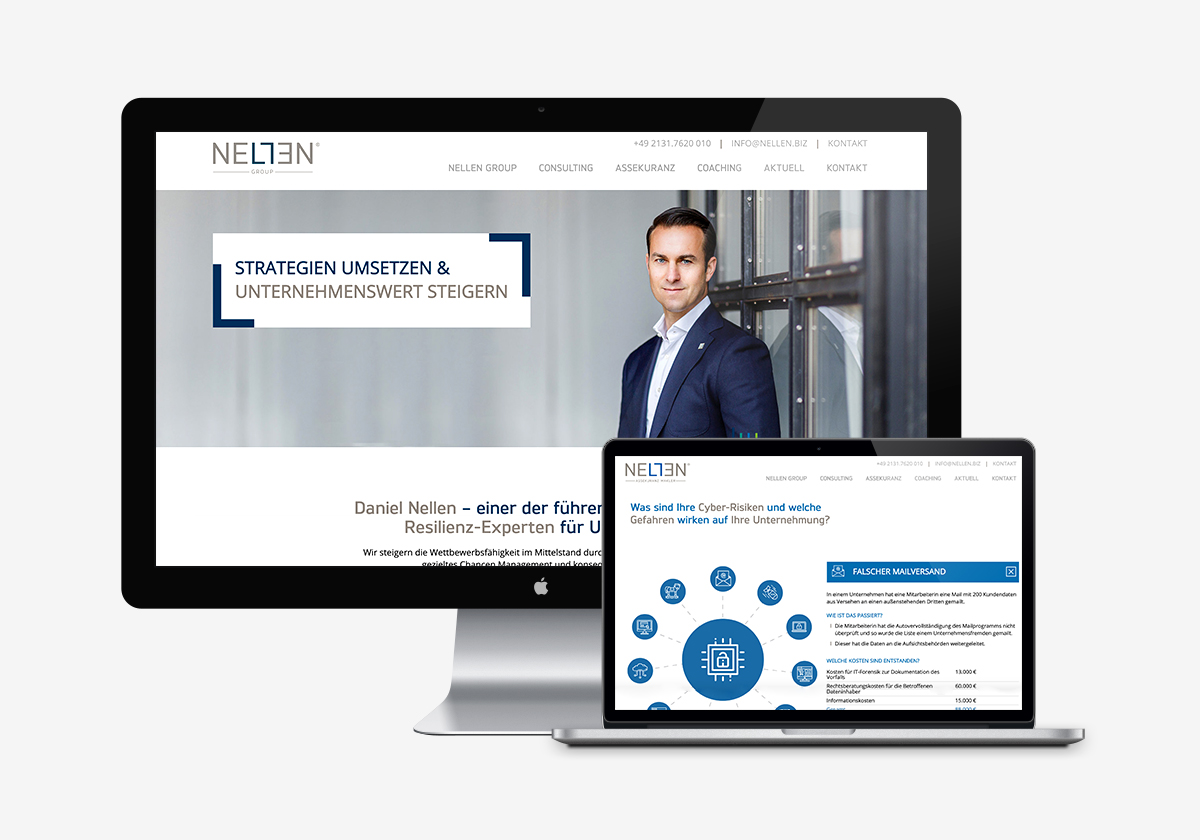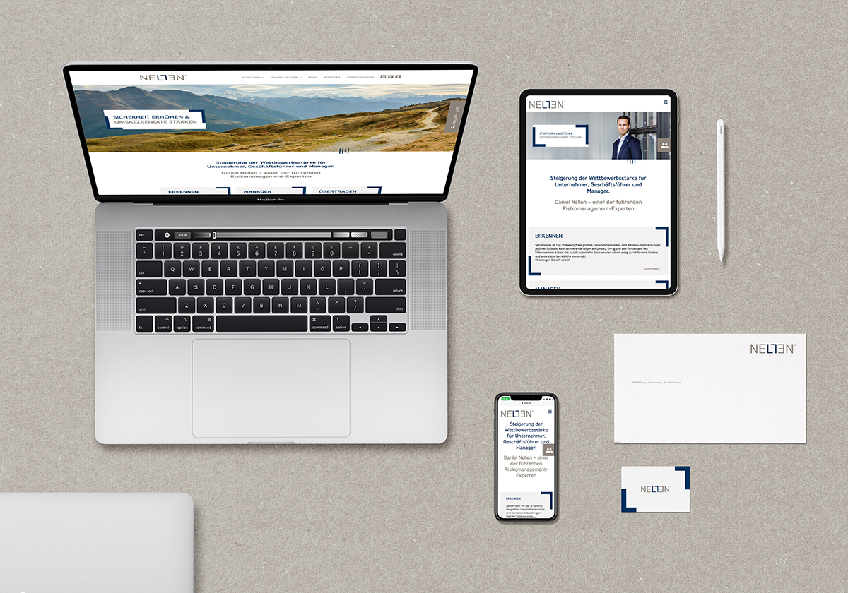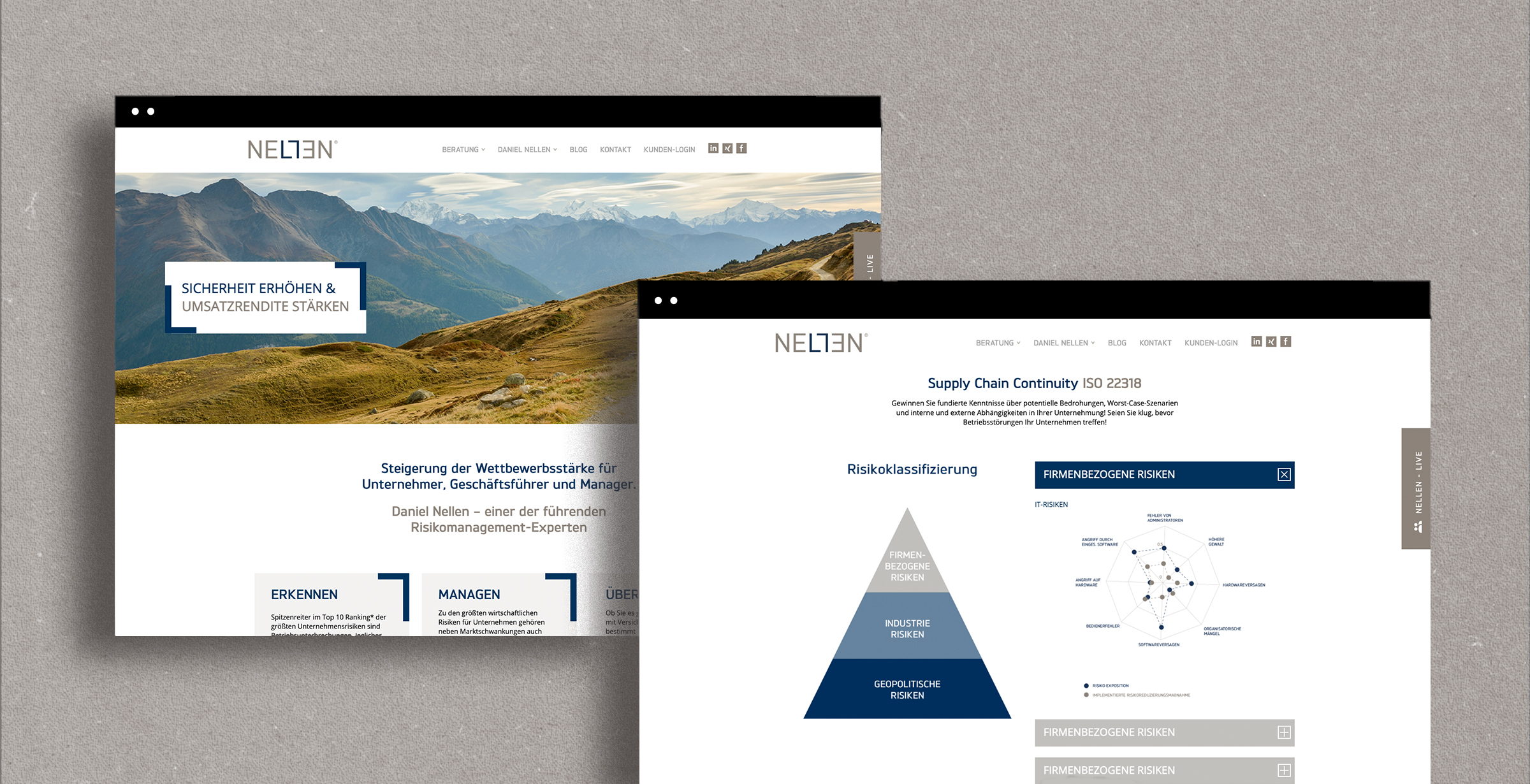 Für die Nellen Group haben wir eine Webseite entwickelt, die komplexe Themen wie Risikomanagement, Resilienz und Beratung klar strukturiert und überzeugend präsentiert. Ziel war es, Vertrauen zu schaffen und die fachliche Tiefe des Angebots sichtbar zu machen – ohne visuelle Überfrachtung. Mit klarem Raster, zurückhaltender Farbwelt und einer Sprache, die Entscheider erreicht. So entsteht ein digitaler Auftritt, der Kompetenz transportiert und Orientierung bietet.