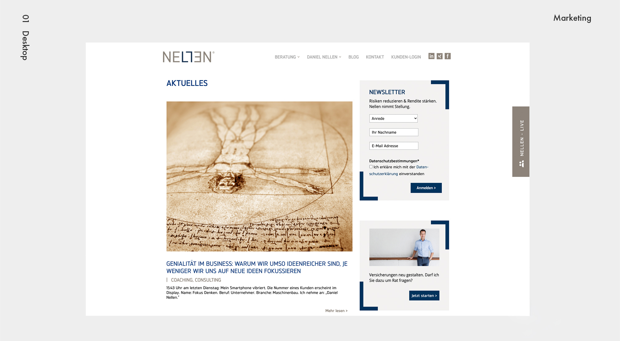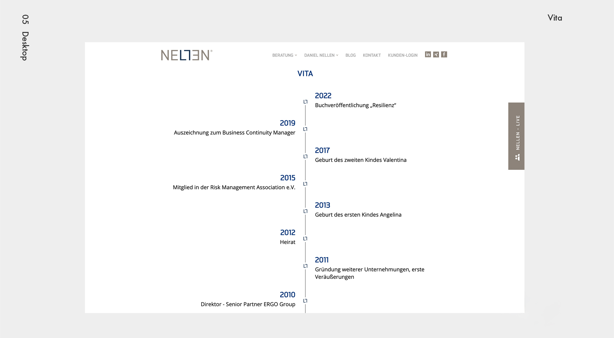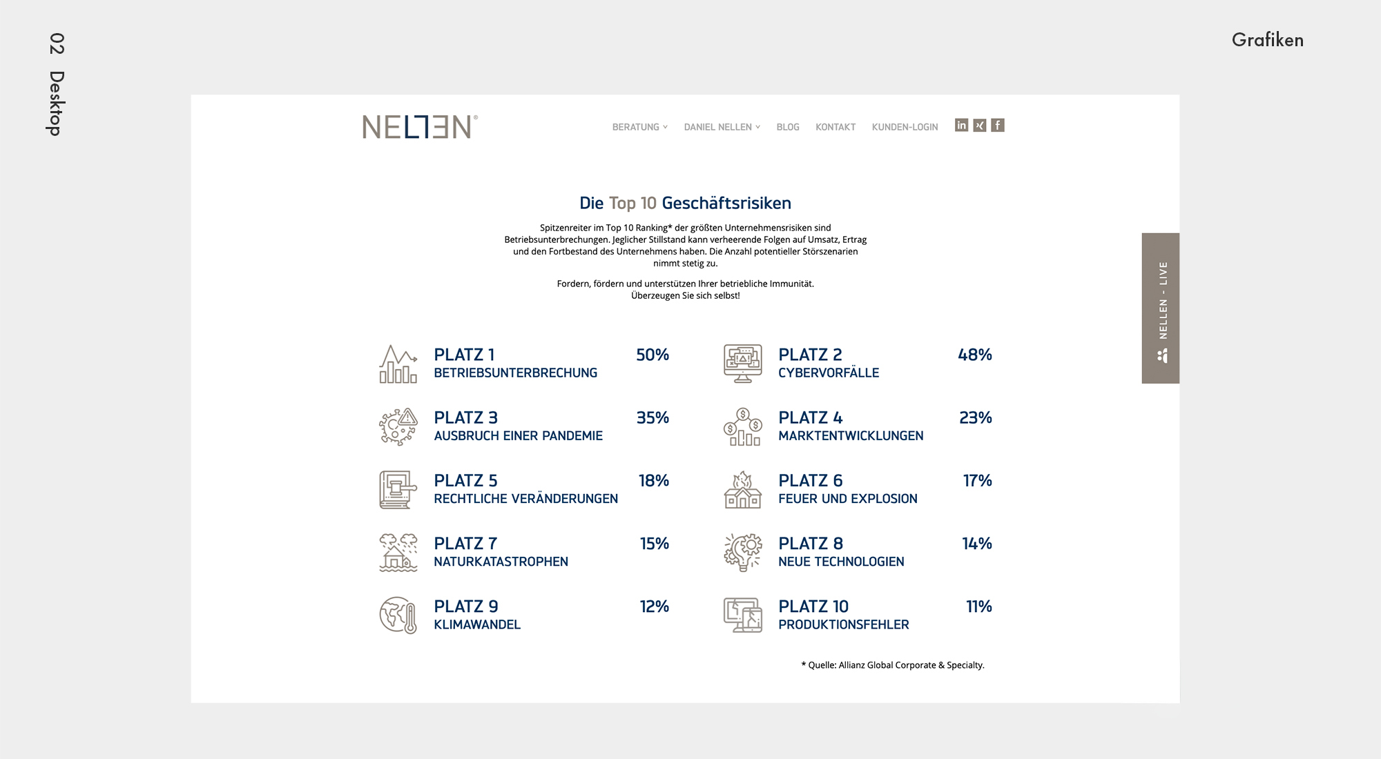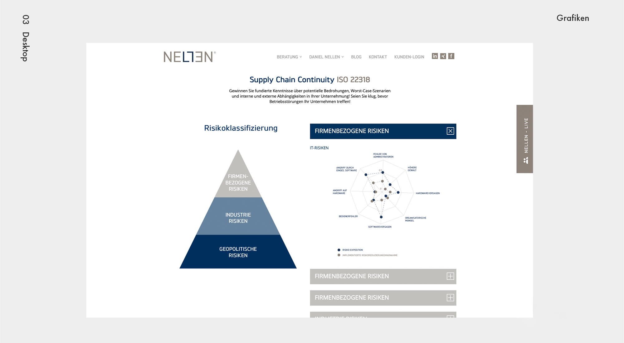 Für die Nellen Group haben wir eine Webseite entwickelt, die komplexe Themen wie Risikomanagement, Resilienz und Beratung klar strukturiert und überzeugend präsentiert. Ziel war es, Vertrauen zu schaffen und die fachliche Tiefe des Angebots sichtbar zu machen – ohne visuelle Überfrachtung. Mit klarem Raster, zurückhaltender Farbwelt und einer Sprache, die Entscheider erreicht. So entsteht ein digitaler Auftritt, der Kompetenz transportiert und Orientierung bietet.